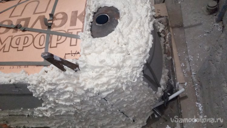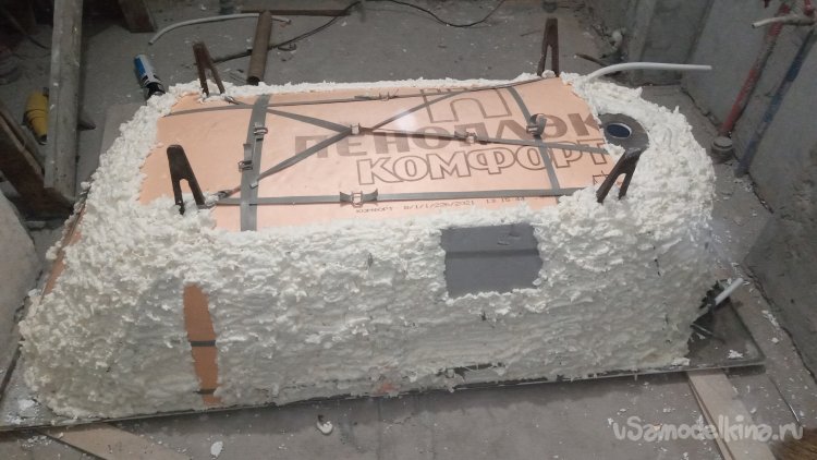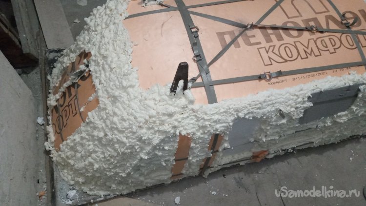 После того, как всё было очень плотно стянуто вдоль, поперёк и по диагонали, я запенил все щели в пенопласте.... А потом и поверху вылил остатки пены из баллона.
