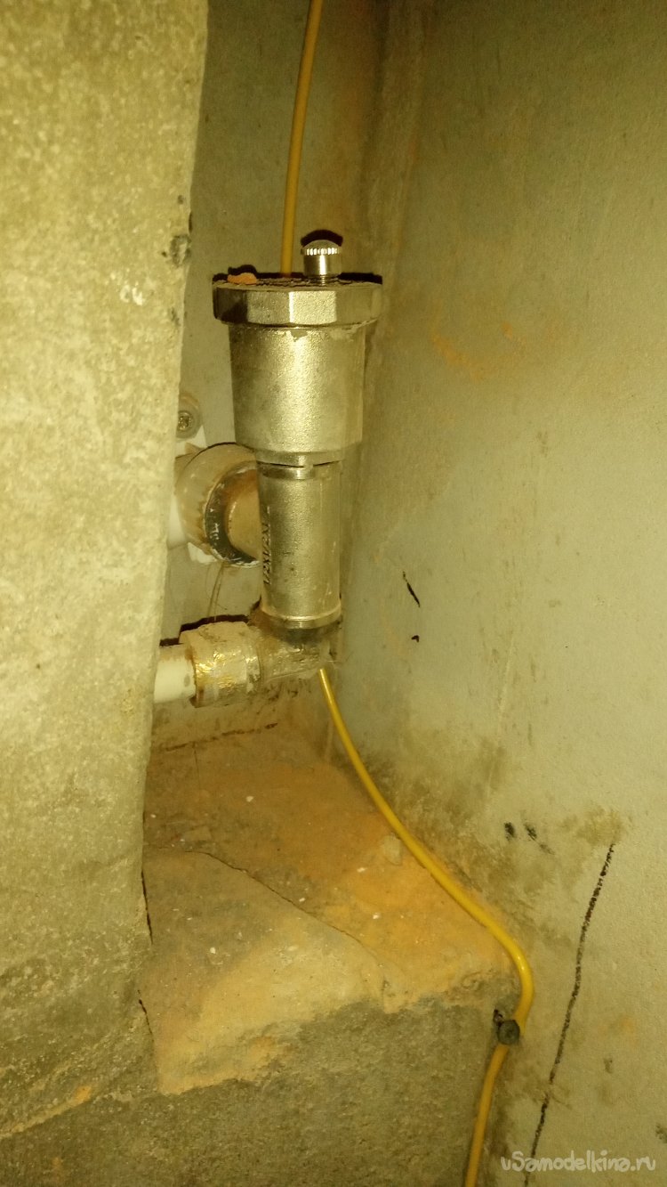 Ещё забыл упомянуть о развоздушке. Обязательно необходимо поставить или кран Маевского, или автоматический воздухоотводчик в самой высокой точке. Я поставил автоматический. Для чего, отвёл трубу с подачи "за угол" и разместил его в нише, которая позже окажется под столешницей: