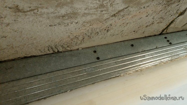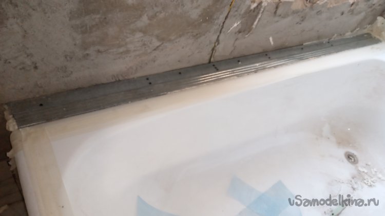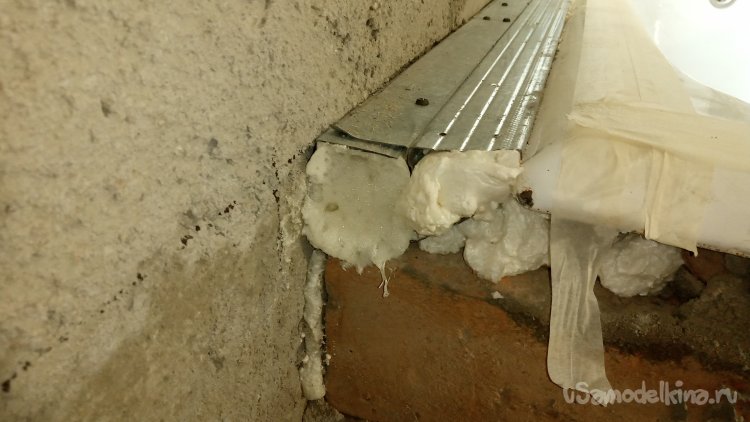 Для симметрии отодвинул ванну от стены. Чтобы сделать "полку", скрутил между собой несколько "стеновых" профилей для гипсокартона (когда-то подобрал, когда сносили перегородку в офисе), прибил конструкцию к стене и запенил внутри для жёсткости: