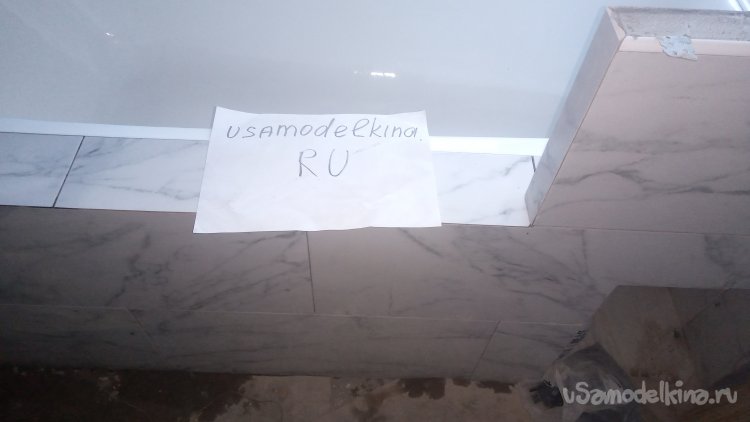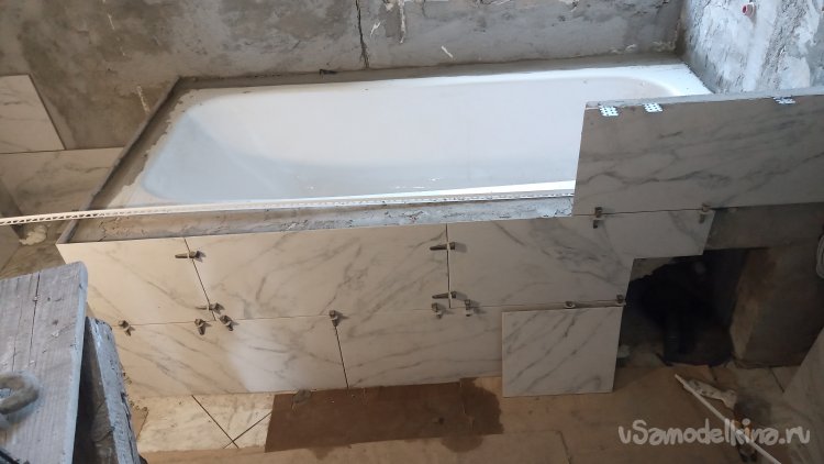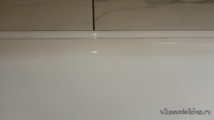 Продолжил обкладку. Горизонтальные участки керамической плитки приклеил к борту ванной на монтажный клей. Торцы задекорировал, используя белый пластиковый наружный плиточный уголок: