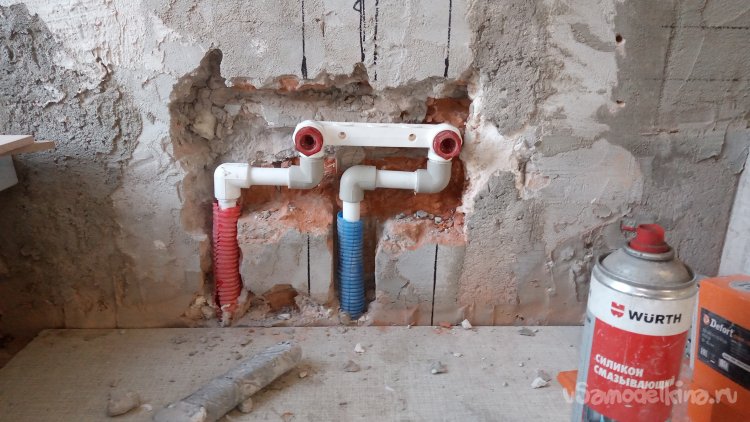 И тут выяснилась ещё одна "засада". После того, как отодвинул ванну, смеситель оказался тоже смещён. Пришлось разбивать перфоратором стену и переваривать трубы: