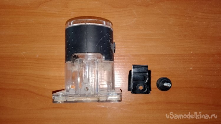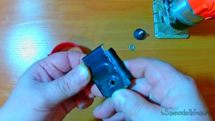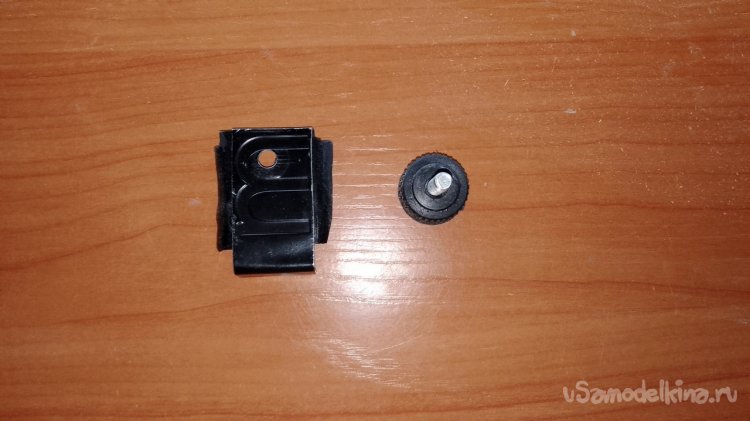Конструкция была готова почти, не хватало лишь фиксатора, который бы прочно удерживал пыльник на платформе. Конструкцию фиксатора сделал из куска жести и обрезка пластика, гайка барашек была родная из комплекта фрезера.