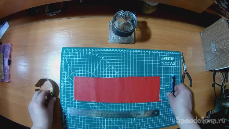 Взял кусок красной экокожи, разметил, так что бы хватило на обе стороны пылеуловителя, разрезал с помощью специального дискового ножа для резки тканей и кожи.