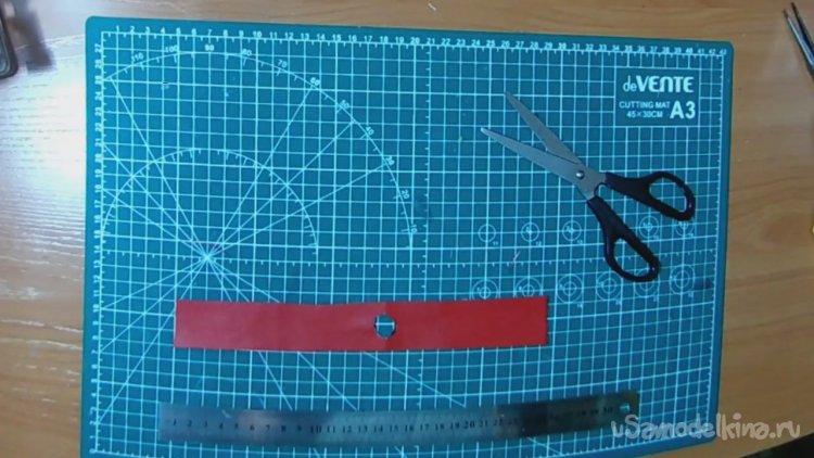 Взял второй кусок экокожи и вырезал в ней отверстие под выход трубки сифона.