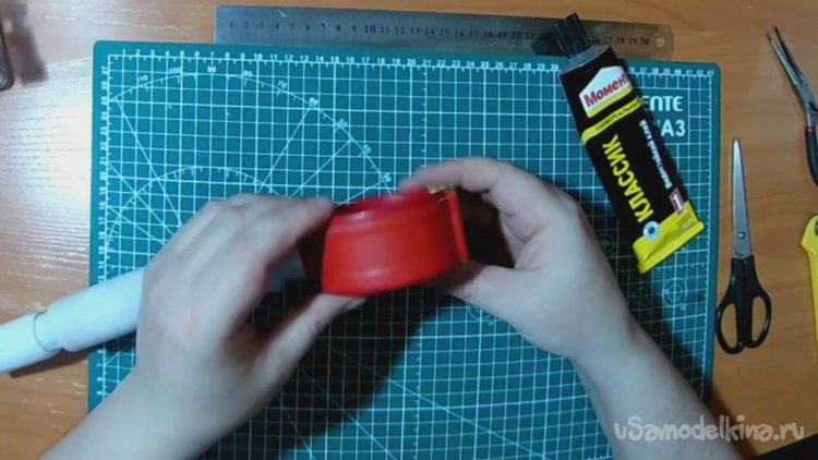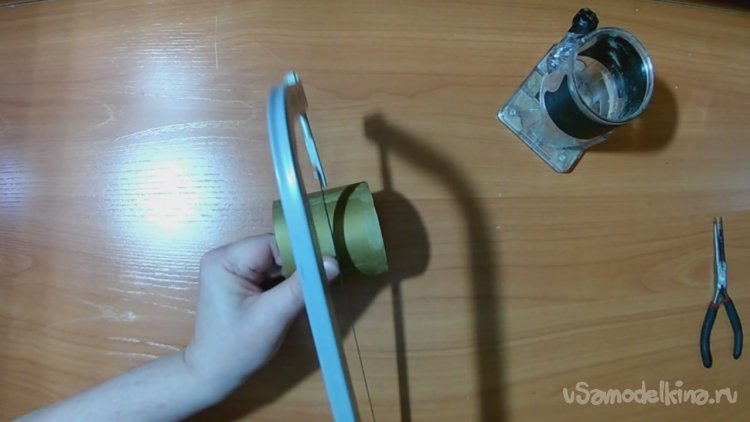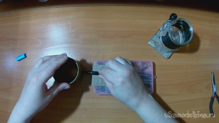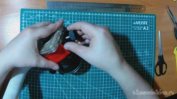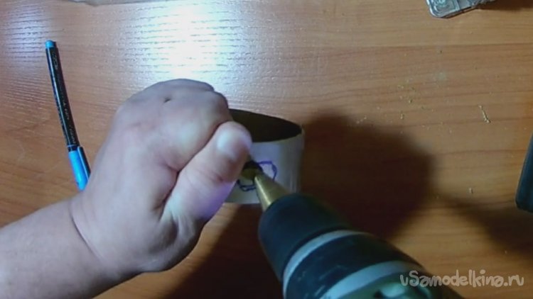 И просверлил отверстие. Отверстие должно быть не больше внутреннего диаметра патрубка сифона, который будем в дальнейшем приклеивать к основе нашего пыльника.