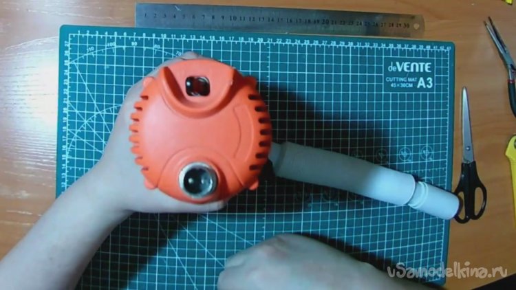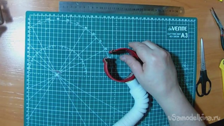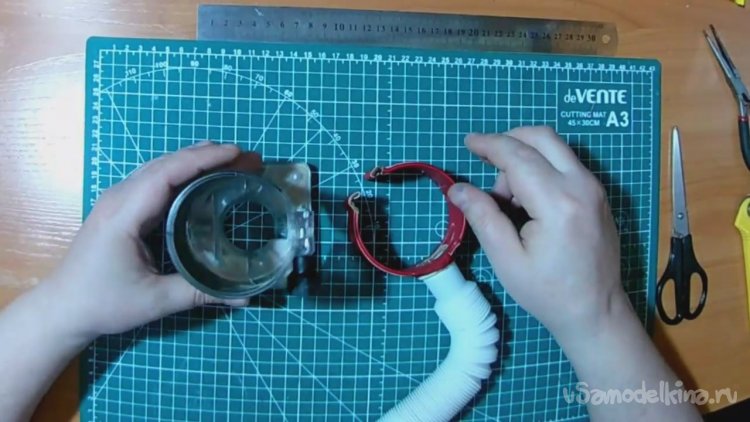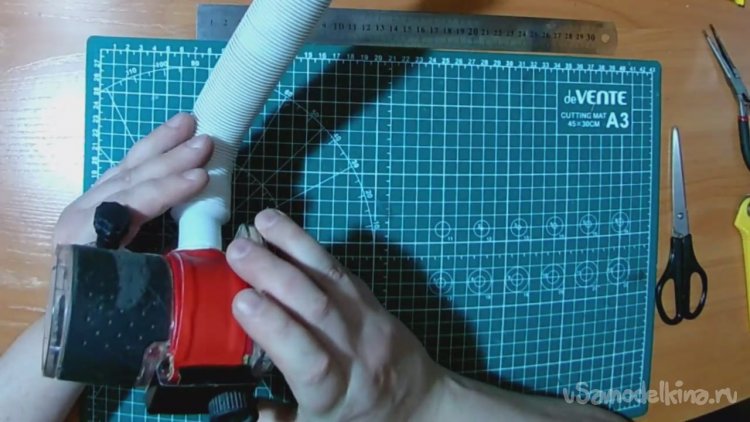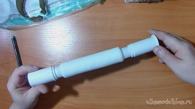 Для выходного патрубка хотел использовать простую трубку, но меня не устроило то, что у трубки тонкие стенки. При приклеивании к основе есть большая вероятность, что она не будет держаться и в один "прекрасный", как это бывает в самый не подходящий момент отвалится. И тут мне совершенно случайно на глаза попадается гофрированный сантехнический сифон для раковины, который пылится у меня, наверное уже года два. В общем буду для выхода на пылесос применять вот такой сифон.