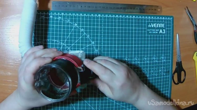 Решил обклеит экокожей наш пылеуловитель. Внутри корпуса оклеил, что бы при всасывании воздух выходил чётко в трубку и не терял мощности из-за щелей, которые были в данной конструкции. Спросите: почему красная экокожа? Да потому что другого материала у меня не нашлось, был под рукой только этот, да и по толщине этот материал подходил идеально.