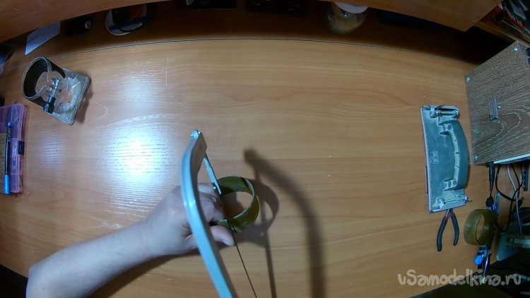 Обратная часть сделана из пластика. Вырезал её из корпуса от старого пауэрбанка. Загнул буквой П при помощи строительного фена и длинногубцев. Вклеил с внутренней стороны шайбу для жёсткости фиксации.