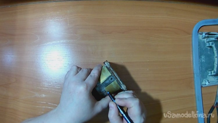 Затем надеваем заготовку на платформу и ставим метки под выпирающую часть крепления.