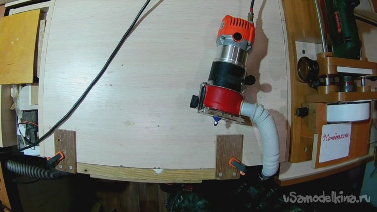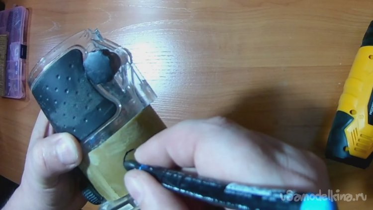 Разметил линию отпила с помощью маркера. Предварительно прикинув площадь покрытия на нижней станине фрезера. Подложил предметы равные высоте метки пропила и вращая заготовку начертил линию.