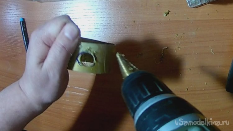 Взял шуруповёрт, вставил в патрон ступенчатое сверло.