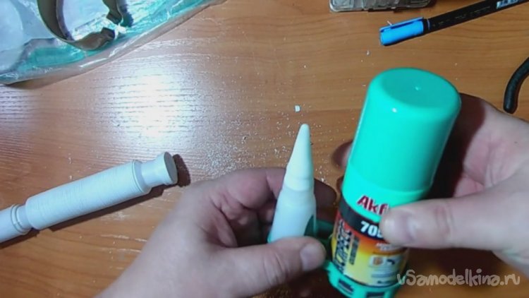 Принцип склеивания таков: для начала брызгаем из аэрозольного баллончика на место приклеивания, далее наносим клей из маленького флакона на ответную сторону и сильно прижимаем детали друг к другу. Детали склеились отлично, попробовал на излом через 10-15 секунд после склейки, держит крепко, но я что-то засомневался и пошёл ещё дальше. Хорошенько промазал клеем по внешнему радиусу трубки и и брызнул из баллончика аэрозолем. Теперь точно не отвалится просто так!