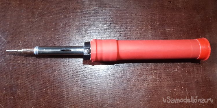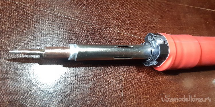 Жало такое же медное. Нагревательный элемент делал как и Toozpick.Ручка сделана из пластмассовой трубы аварийного слива сифона для ванн. Обтянул термоусадкой. В качестве держателя для жала приспособил отпиленный рожок от люстры, который вкручивается в заднюю часть электропатрона типа "Миньён".