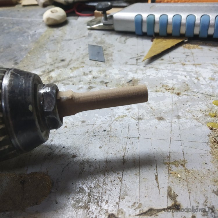 Я зажал было ее в дрель, пытался выровнять, вроде получилось. Прошлифовал при станке, получилась полукруглая палочка. Полукруглая, потому что круглая только половина. Вторая половина нормально сжалась патроном до нужного состояния. Ее я только подравнял ножом.