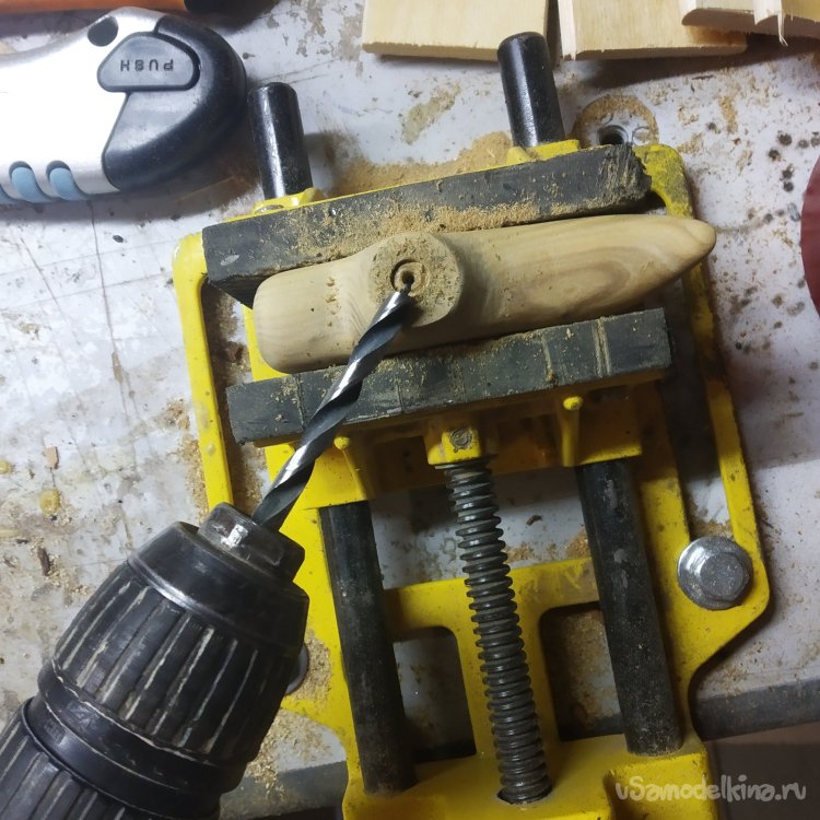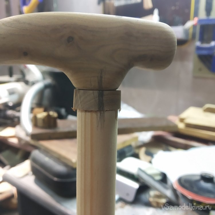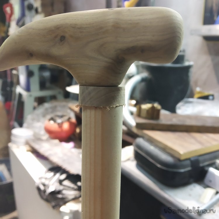 Проставку я решил делать тоже из яблони. НО появилась проблема – шкант короткий. Поэтому мне пришлось делать новый. Им стала обточенная ножом яблоневая палка. Грубо, сердито, вроде надежно. Ну и кривизна проставки полностью нивелировала кривизну всех деталей трости.