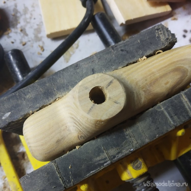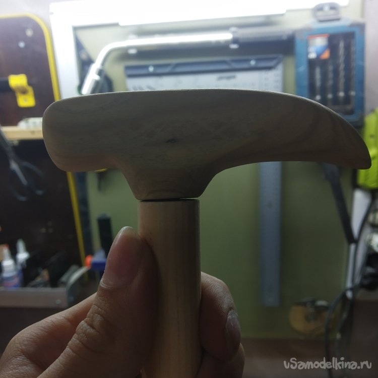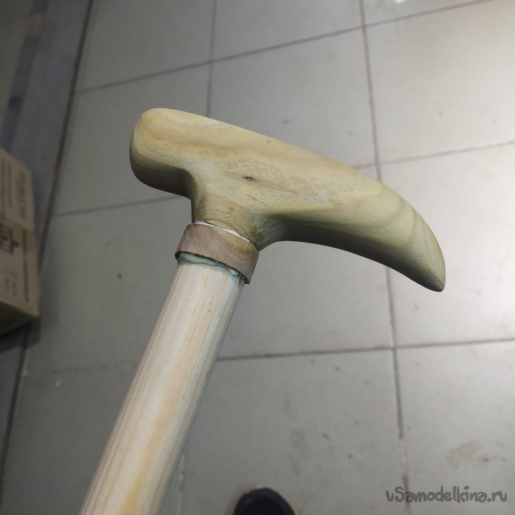 Примеряю к палке, вроде все сходится. Но как-то коротковато крепление рукояти. Надо исправлять. Но позже. Сначала надо просверлить отверстия для шканта, а то клеевое соединение на торец сосны – не очень верное решение.