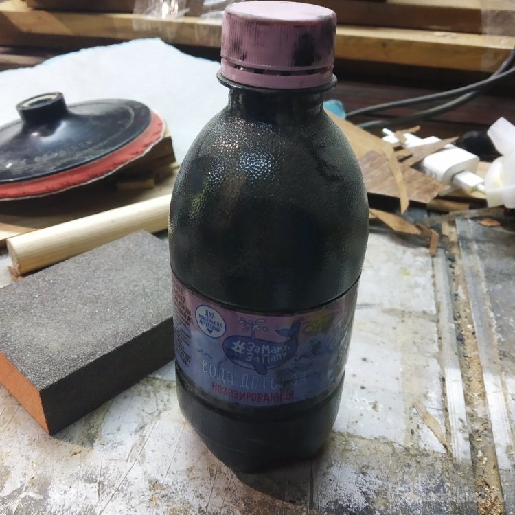 Далее следует покраска. Для самой палки я использовал самодельную морилку «Блэкаут», чтобы прям затемнить все полностью. А для рукояти специально изготовил красно-каштановую. Вообще я сначала покрыл рукоять просто красной морилкой, но она оказалась хилой, поэтому я плеснул в нее немного Блэкаута.