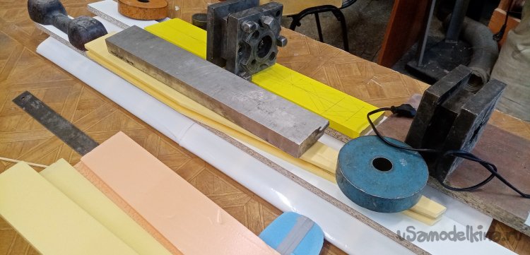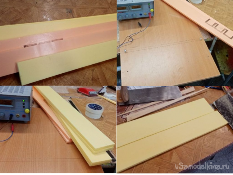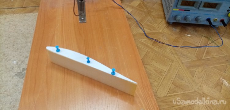 Все нервюры вырезаются самодельным вертикальным термолобзиком. А также вырезана средняя усиленная нервюра крыла из утеплителя толщиной в 50 мм. Усиление необходимо. Поскольку в этом месте крыло при помощи резиновых жгутов будет крепиться к фюзеляжу. Питание на спираль термолобзика подается от лабораторного агрегата в 30В 3А. На спираль подается 4В 1.5А.