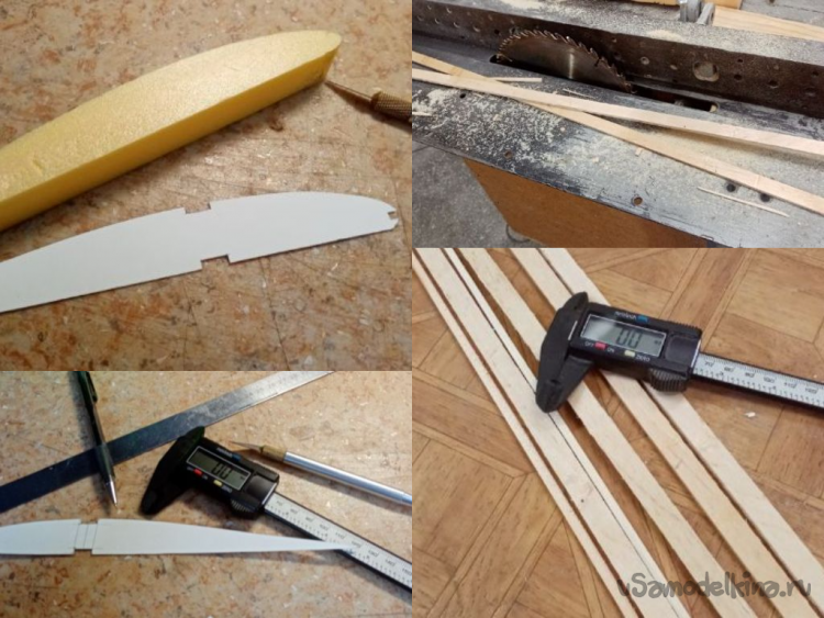 Затем из остатков 4 мм фанеры на большой циркулярной пиле нарезано 4 стрингера толщиной 4 и шириной в 10 мм . Заготовки обработаны утюжками со шкуркой номер 180 и готовы к производству. Также из сосновых брусков напилены заготовки на переднюю кромку крыла сечением 5х5 мм. Замеряю точную толщину и ширину будущих стрингеров из следующей заготовки полукартона. Изготовил второй шаблон для вырезания посадочных мест стрингеров и передней кромки будущего крыла.
