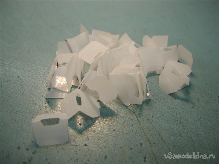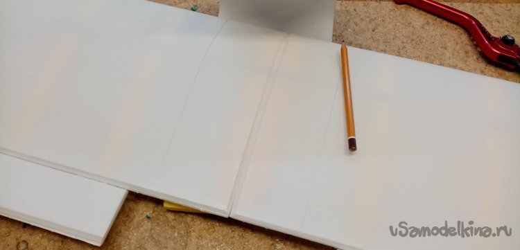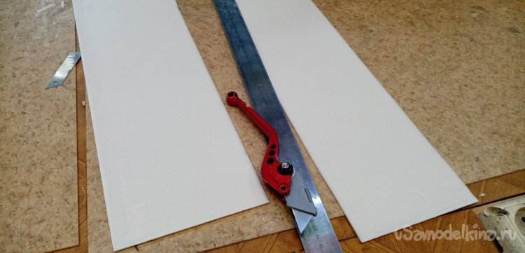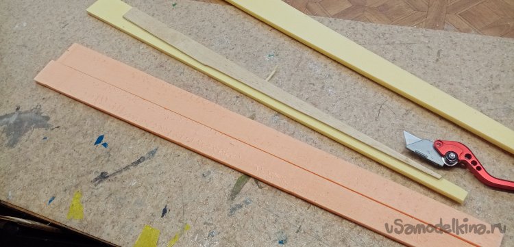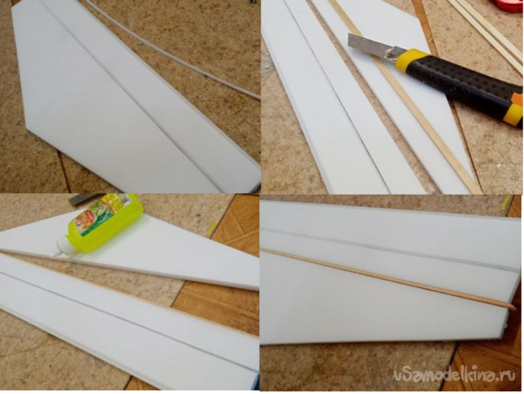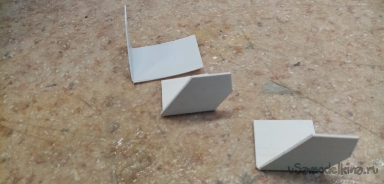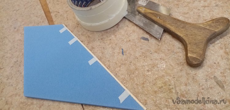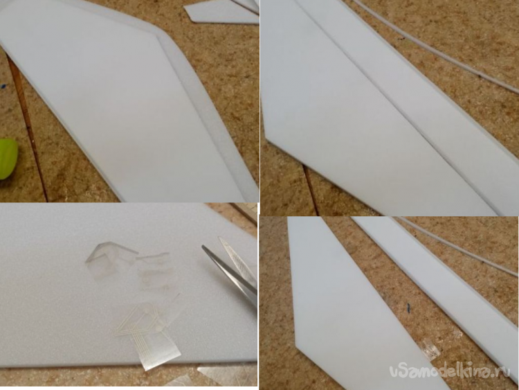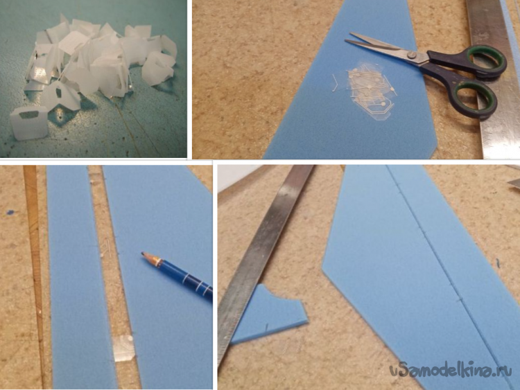 Заранее заготовим элероны из двойной потолочной плитки. Предварительно нарезаем петли из пленки. Немного потрем шкуркой для более прочной склейки.