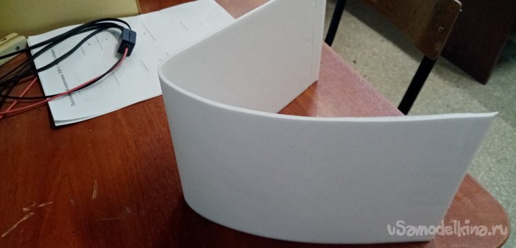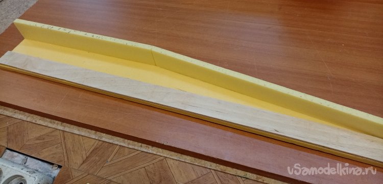 Я сгибаю о гладкий край стола, прижимая руками и протаскивая заготовку. Прокатываю середину и одну сторону . Она пойдет на верхний участок крыла. Во время оклейки каркаса не будет амортизировать.