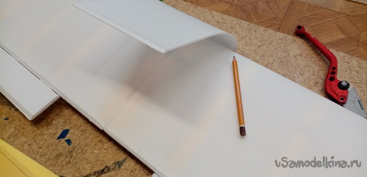 Займемся подготовкой потолочной плитки для обшивки крыла. Нужно посмотреть в каком направлении она лучше гнется. У некоторых производителей вдоль этой линии стоят треугольники. Находим центральную линию заготовки, наклеиваем прозрачный скотч. Он предохранит этот участок от растрескивания при сгибании. Есть три способа согнуть по радиусу середину обшивки.