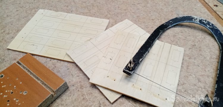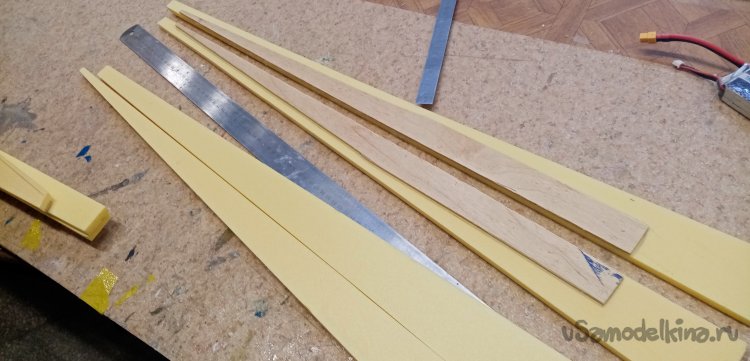 Длинную заготовку распиливаю на небольшие кусочки под размах моего маленького лобзика и вперед. Выпиленные заготовки немного ошкуриваю утюжком. В четырех рамках пропиливаю с боку небольшие пазы для вывода проводов управления сервоприводов вверх. Они будут проходить по верхней обшивке крыла. Изначально протаскивали проводульки через отверстия внутри набора крыла. Но уж больно муторно.