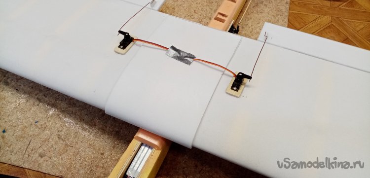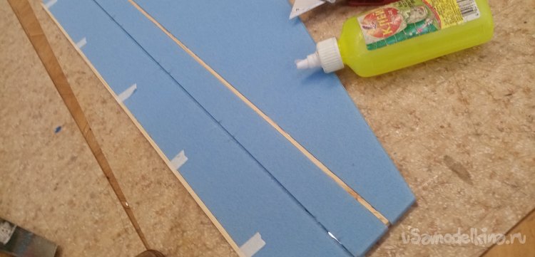 Наносим клей на противоположные стороны заготовок элеронов, устанавливаем заранее петли и склеиваем. Помещаем под пресс.