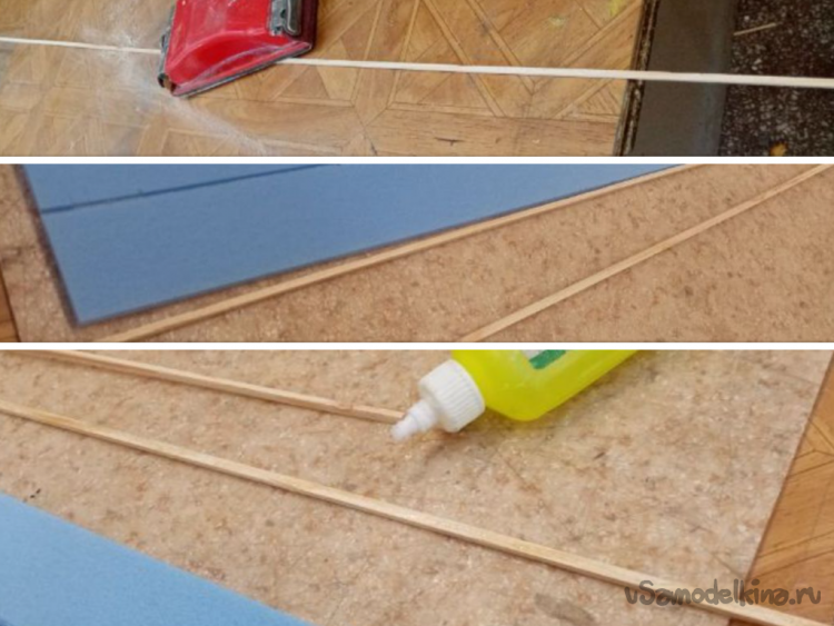 Из фруктовой фанеры нарезаю заготовки усиления на борта фюзеляжа. Немного шкуринга и можно приклеивать фанерки.