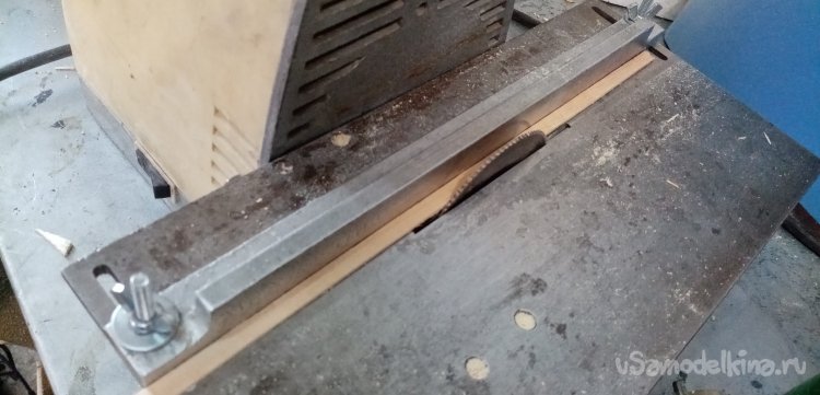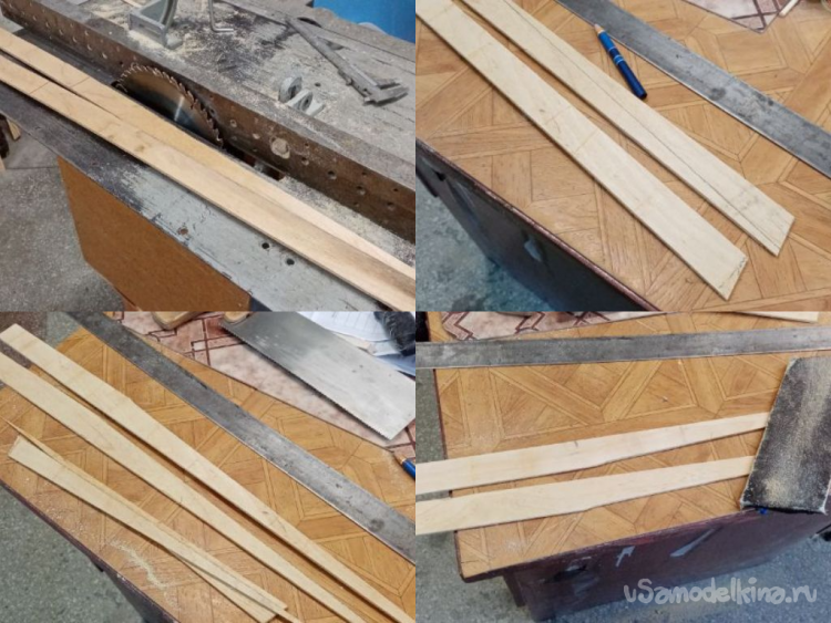 После склейки руля высоты отрезаю от заготовки подвижную часть. Срезаю её грани под углом в 45 градусов. Врезаю петли навески и опять под пресс. Пока заготовки сохнут нужно заготовить рейки усиления. На большой циркулярке отрезаю нужный размер, с легким припуском. Затем на станке «Умелые руки» с установленной фрезой калибрую в размер и окончательно довожу утюжком со шкуркой до 8х4мм.