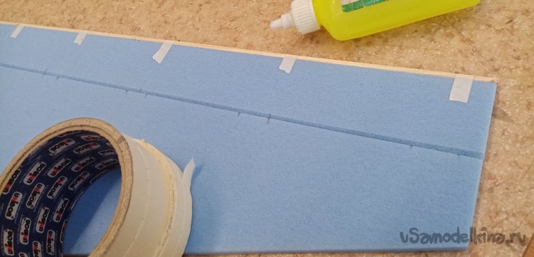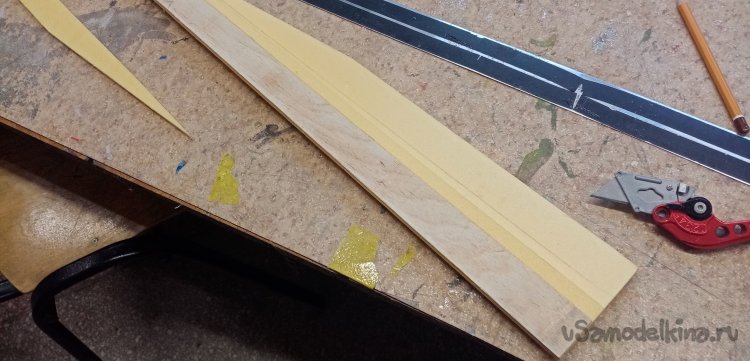 Сейчас изготовим дополнительное усиление средней части. Где на обшивку будут давить резиновые жгуты крепления к фюзеляжу. Размечаем необходимую ширину пластины потолочной плитки. Вырезаем учитывая направление наилучшего сгиба. Наклеиваю на середину прозрачный скотч. Сгибаю заготовку о край стола.