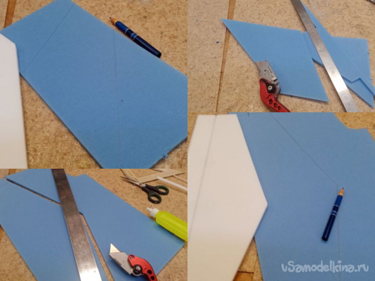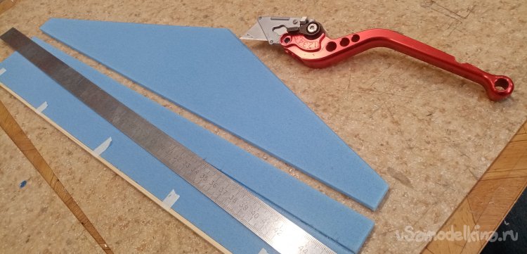 На второй самолетик буду делать оперение, из синей подложки под ламинат толщиной в 5 мм. При помощи готовых элементов потолочки копирую размеры на подложку и вырезаю детали.