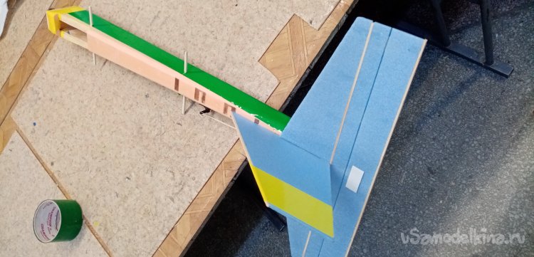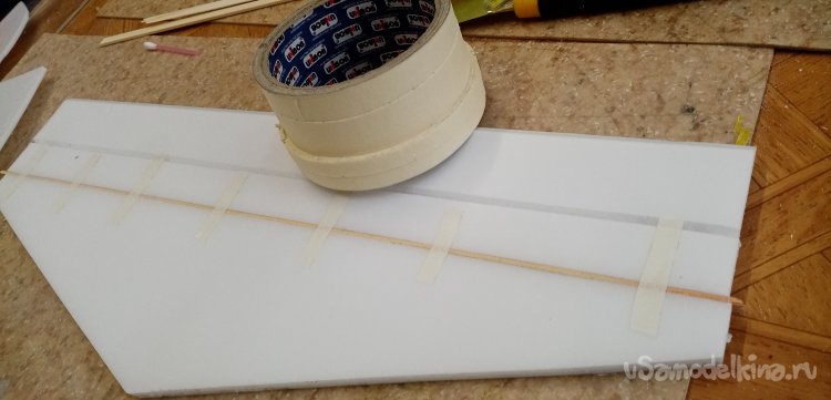 Рейку усиления наклеиваю на заднюю грань подвижной части руля высоты. Затем разрезаю неподвижную часть руля на расстоянии в 25 мм от перегиба. Вклеиваю еще одну рейку усиления на титан. Фиксирую соединение при помощи полосок малярного скотча с двух сторон.