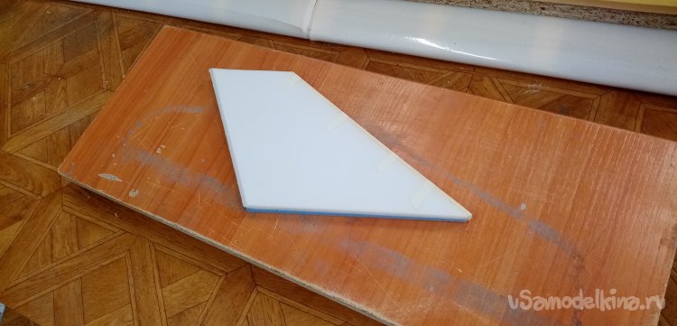 Вырезанную заготовку наклеиваю на второй кусок потолочной плитки и затем обрезаю в чистовой размер. В этом варианте руль высоты и направления будет выполнен из двойной потолочки. Склеенные детали помещаю под пресс.