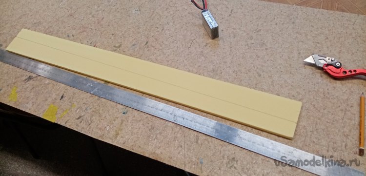 После склейки нужно вырезать заготовки на нижнюю и верхнюю часть фюзеляжа. Для уточнения размеров примеряю силовую батарею в 1500 мач. Ориентируясь на этот размер, размечаю парочку заготовок наверх и низ фюзеляжа.