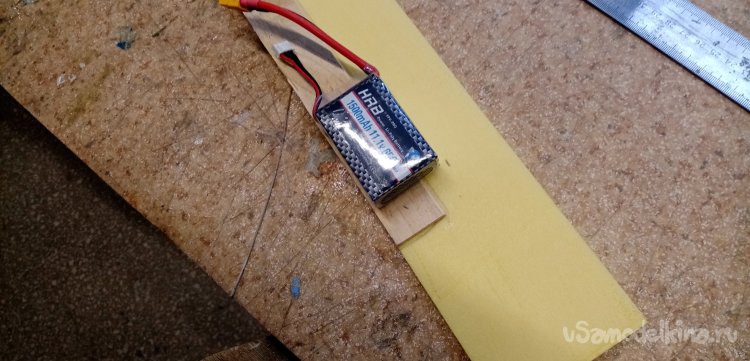 Методом научного тыка, нашел центр тяжести самолетика в сборе с крылом. Прорезал батарейный отсек.