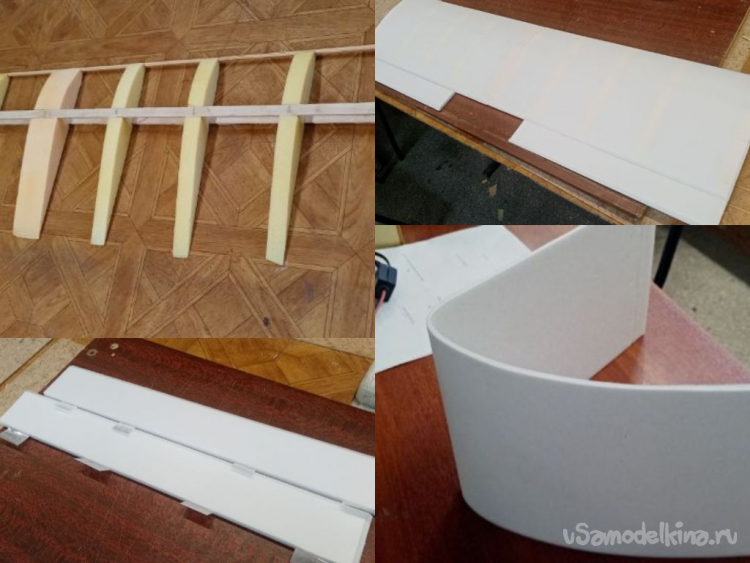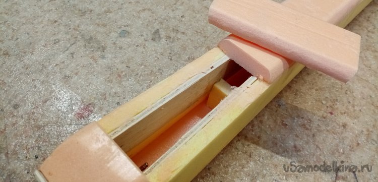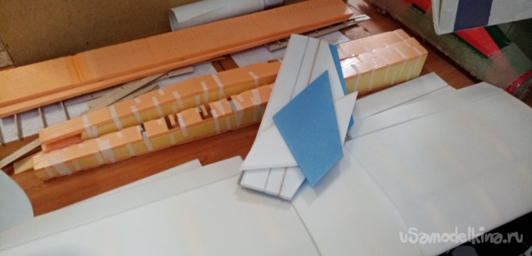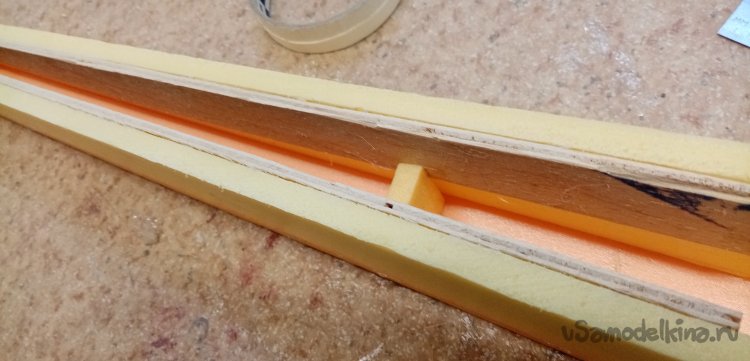 Затем приклеиваю днище к двум вариантам фюзеляжа, вставляя фиксирующие переборки из кусочков пенопласта, для соблюдения параллельности стенок. После склейки демонтирую.