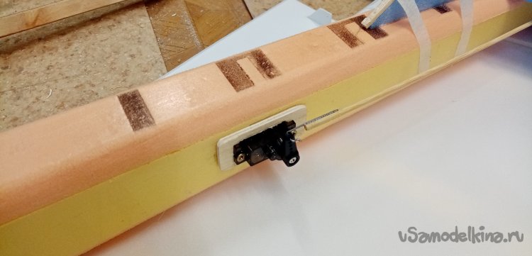 Ориентируясь на уже приклеенные рамки для крепления сервоприводов, размечаю в элеронах отверстия для монтажа кабанчиков. Нужно помнить, что отверстия в верхнем роге кабанчика для крепления тяги должны располагаться над шарниром перегиба элерона. Отверстия прорезаю скальпелем.
