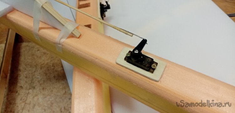 Перед установкой управления приклеиваю на хвостовую часть фюзеляжа руль высоты и руль направления. После рамку сервопривода и начинаю монтаж. Небольшой прокол, первый сервопривод решил разместить на боковой стороне, но там проходит фанерка усиления. Не стал переделывать, отверстие прорезал при помощи бормашины. На втором фюзеляже, сервопривод разместил на гаргроте, подальше от повреждений.
