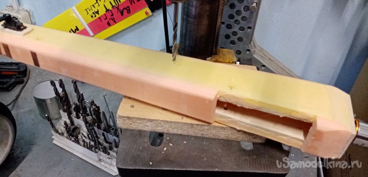 Далее как и в первом варианте. Нужно отрезать подвижную часть руля высоты. Навесить на пластиковые самодельные петли. Отверстия для установки петель прорезаю ранее изготовленным устройством. Которое позволяет попасть точно посредине торца.