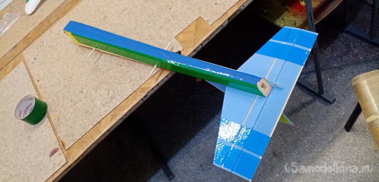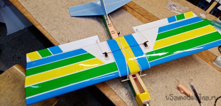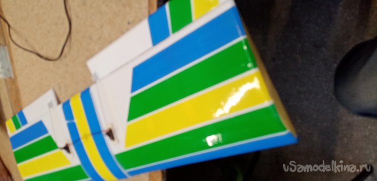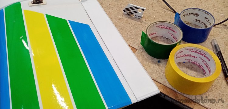 Затем от души полосок на крылья. Цветной скотч режу прямо на пенопласте, самодельным резаком, который прорезает сотые доли миллиметра. Практически не повреждая пенопласт.