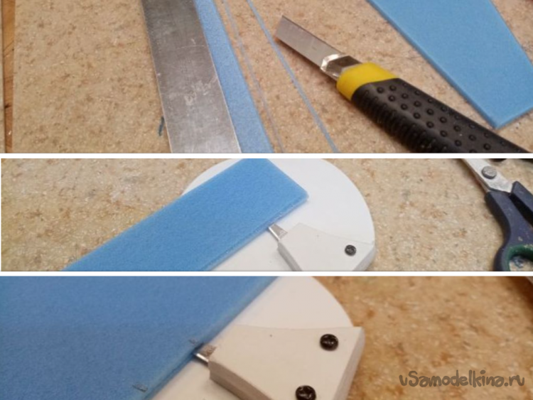В дело вступает самодельная конструкция плоскореза. Состоящая из основания, парочки длинных болтов в отверстиях его. Позволяющий путем вкручивания и выкручивания регулировать толщину реза. А также рамочного термореза и блока питания.