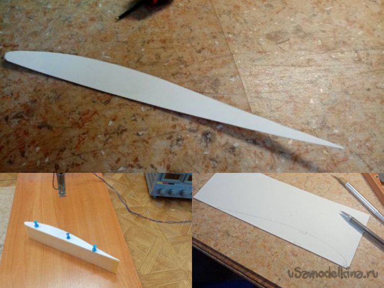 Как правило, все модели начинаем изготовлять с крыла. Профиль выбран произвольно, достаточно несущий с плоской нижней поверхностью, для удобства изготовления. Высота 25 мм, хорда 240. На листе полкартона вычерчиваю шаблон нервюры. Которые будут вырезаться из утеплителя, вертикальным самодельным термолобзиком. Края шаблона натираю грифелем мягкого карандашом «кохинор» 8В.