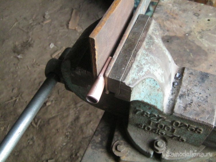 Фото 13. Отожженная мягкая медь легко гнется без трещин. Чтобы на наконечниках не отпечаталось рифление губок, между ними и заготовкой подложил пару стальных пластин.