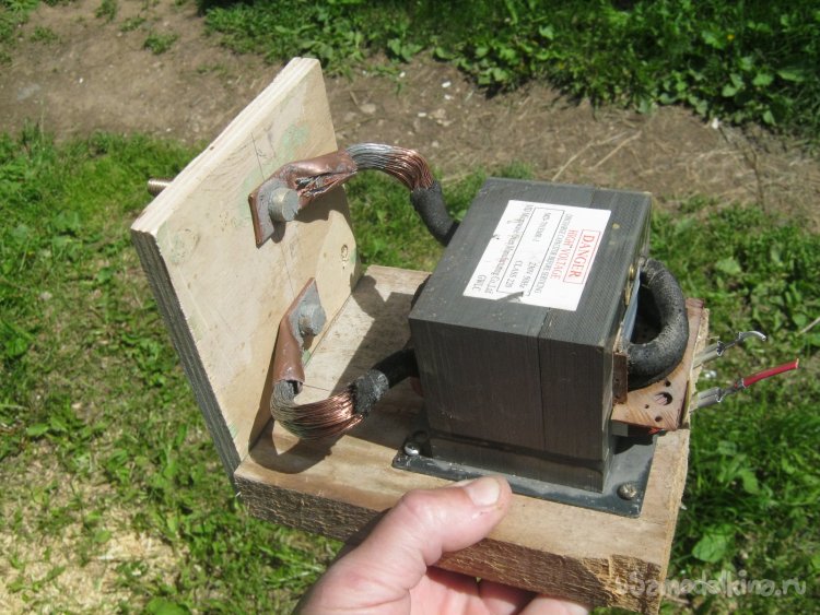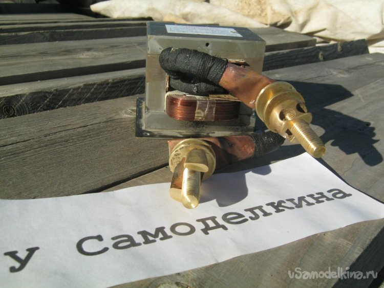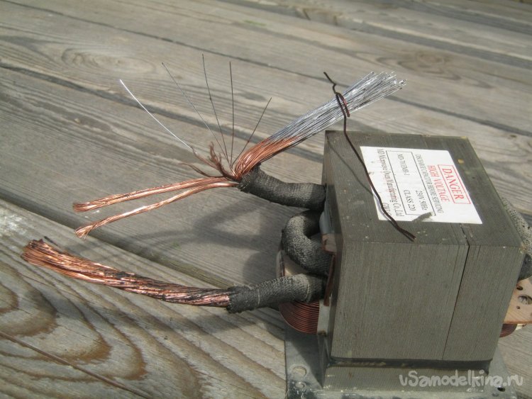 Фото 15. Традиционный высоковольтный трансформатор от микроволновки с перемотанной вторичной обмоткой. Провод самодельный, сложенный из двух сварочных, освобожденных от резиновой оболочки для экономии площади «окна». Новая изоляция – резиновой же изолентой на тканевой основе. Выходные концы укоротил, обрезал лишнее, зачистил от изоляции. Провод состоит из отдельных прядей. Каждую расплетал, зачищал наждачкой, лудил. Паяльником, ПОС-61 со спирто-канифольным флюсом. Семен Семеныч, далеко а надо!