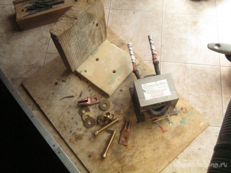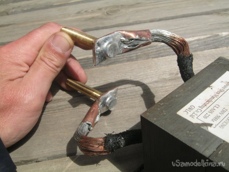 Для надежного присоединения мощного провода трансформатора сделал пару медных частей из 15-ти мм. трубы для водопровода.