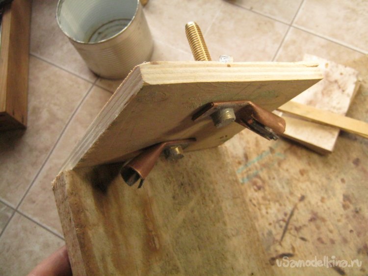 В ящике – блоке питания точечной сварки, отверстия для клемм расположены одно над другим, расстояние от трансформатора до стенки с клеммами определено и относительно невелико – короткие толстые и жесткие провода придется сильно изгибать. Во время пайки, припой капиллярными силами затащит между жилами и превратит значительную часть каждого провода в металлический монолит – паять их следует уже сформованными нужным образом, так как они и будут располагаться в корпусе. Пришлось сделать одноразовую деревянную оснастку для пайки.