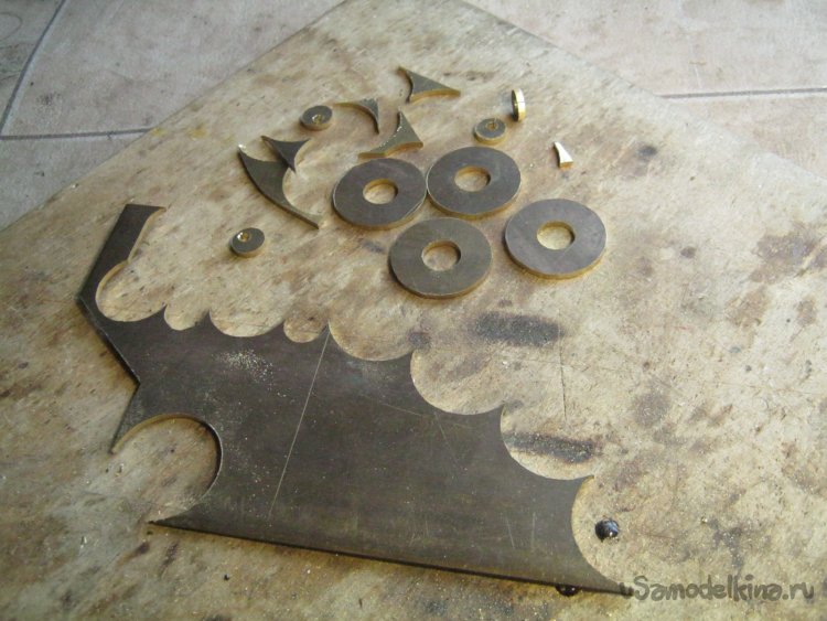 Фото 24. Две пары латунных шайб разметил и выпилил ювелирным лобзиком из 2 мм латунного листа. Пилочка №0, самодельная, из нетонкой фанеры, подставка «ласточкин хвост». Внутренние отверстия шайб также выпилены. Хоть и много дольше сверления, получается не в пример аккуратнее. Выпиленные заготовки шайб наждачкой с некрупным зерном зачистил от окислов, по одной закрепил на болтике М10 с гайкой и сунул в шуруповерт – минута работы инструмента и выровнены торцы. Здесь применил наждачку покрупнее.