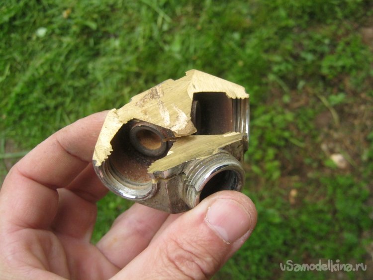Фото 6. Огрызок от душевого смесителя. Некогда, каким то чудом уже удалось выкроить из него нетонкую пластину. Увы, это случай нечастый, объясняемый, как видно, недосмотром изготовителя и моей хорошей кармой. Обычно, стенки такой детали прискорбно тонкие.