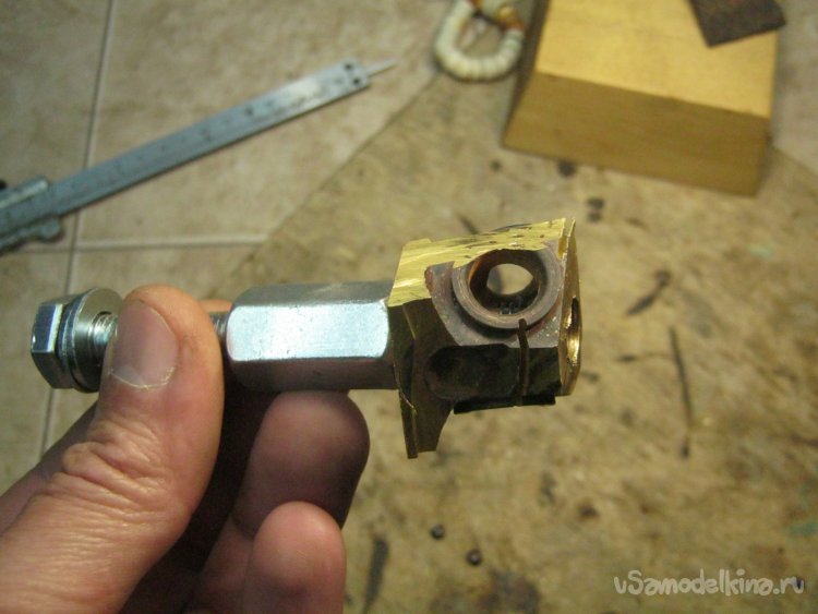 Гайки. Увы, достаточно массивных заготовок из меди или сплавов, в своих закромах не нашел, что в очередной раз заставляет задуматься о некрупном литье из бронзы. Заготовкой для моих гаек послужила латунная болванка сложной формы – остатки от старого основания смесителя для ванной (Фото 6).